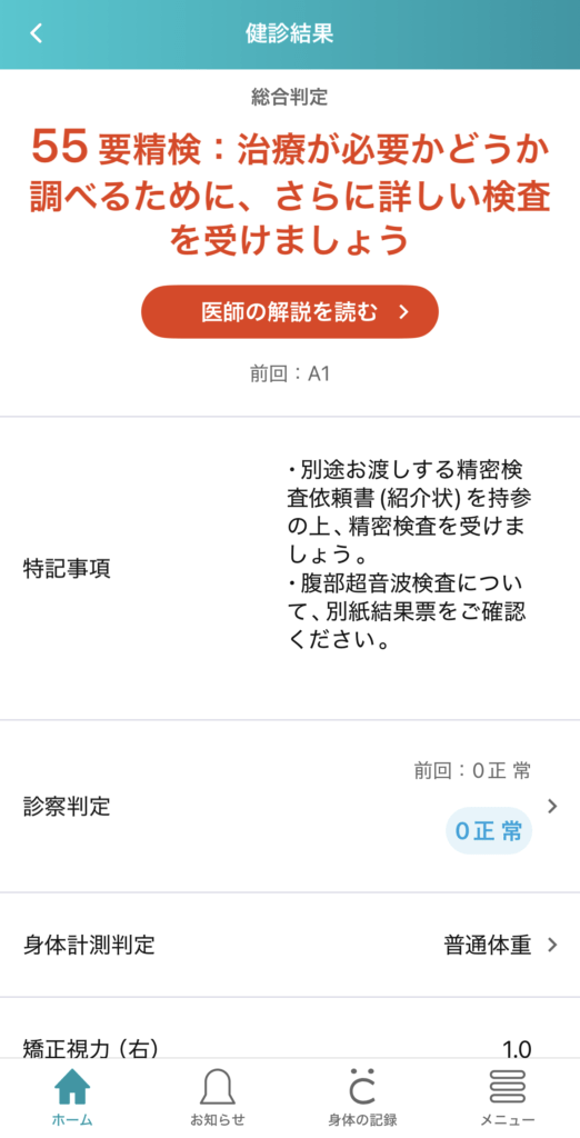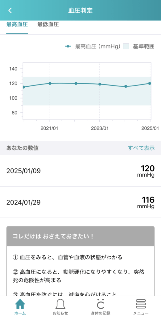 健診結果の推移がグラフで表示されるため、毎年の変化を視覚的に把握できます。さらに、基準値から外れている項目も一目で確認できるので、日々の健康管理や生活習慣の見直しに役立ちます。