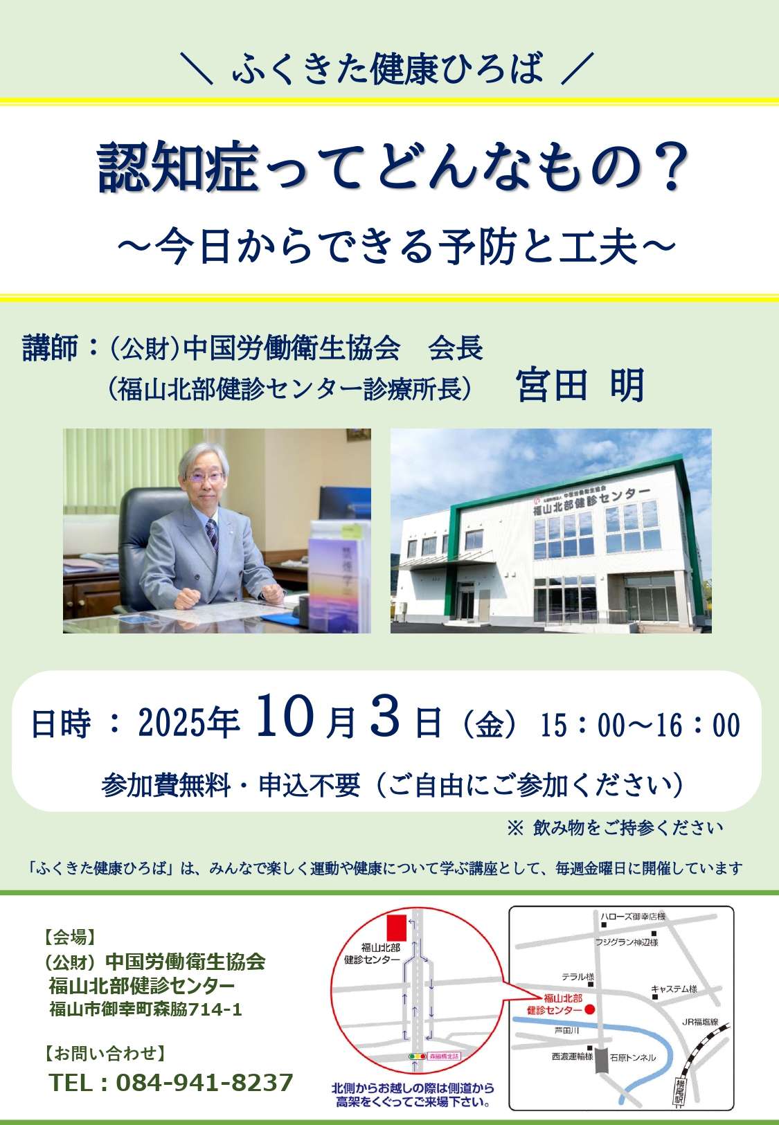 ふくきた健康ひろば:「認知症ってどんなもの?」~今日からできる予防と工夫~日時:10月3日(金) 15時~16時 2025 10/26 ふくきた健康ひろば 「認知症ってどんなもの?」~今日からできる予防と工夫~ 講師:(公財)中国労働衛生協会 会長 宮田 明日時:10月3日(金) 15時~16時参加費無料・申込み不要(ご自由にご参加ください) 認知症ってどんなもの?~今日からできる予防と工夫~ 閲覧回数: 2,149 お知らせ 福山北部健診センター