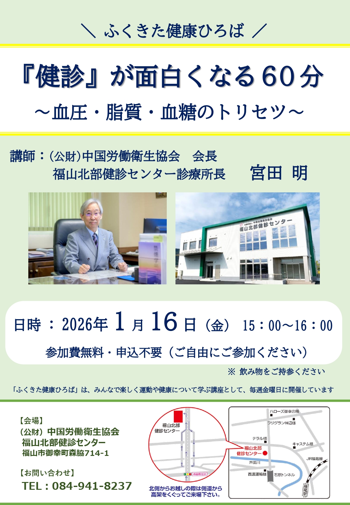 ふくきた健康ひろば:『健診』が面白くなる60分~血圧・脂質・血糖のトリセツ~日時:1月16日(金) 15時~16時 2025 12/23 ふくきた健康ひろば 『健診』が面白くなる60分~血圧・脂質・血糖のトリセツ~ 講師:(公財)中国労働衛生協会 会長 宮田 明日時:1月16日(金) 15時~16時参加費無料・申込不要(ご自由にご参加ください) 『健診』が面白くなる60分~血圧・脂質・血糖のトリセツ~ 閲覧回数: 600 お知らせ 福山北部健診センター