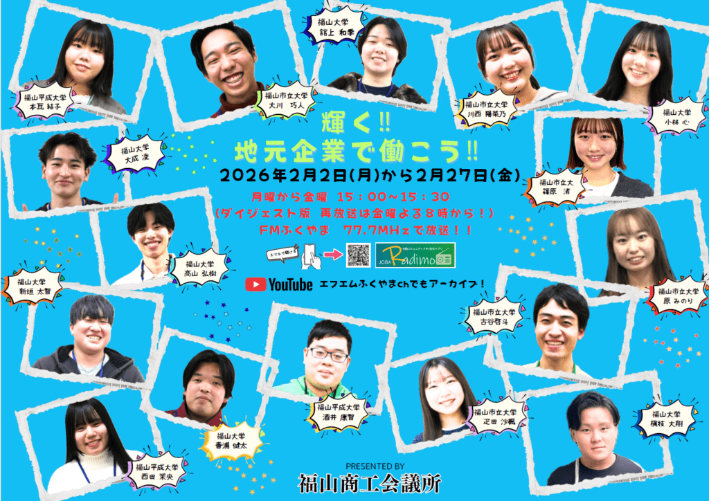 就活応援ラジオ「輝く地元企業で働こう!」は、福山商工会議所主催の福山大学・福山平成大学・福山市立大学との産学連携の一環として毎年放送されるラジオプログラムです。
