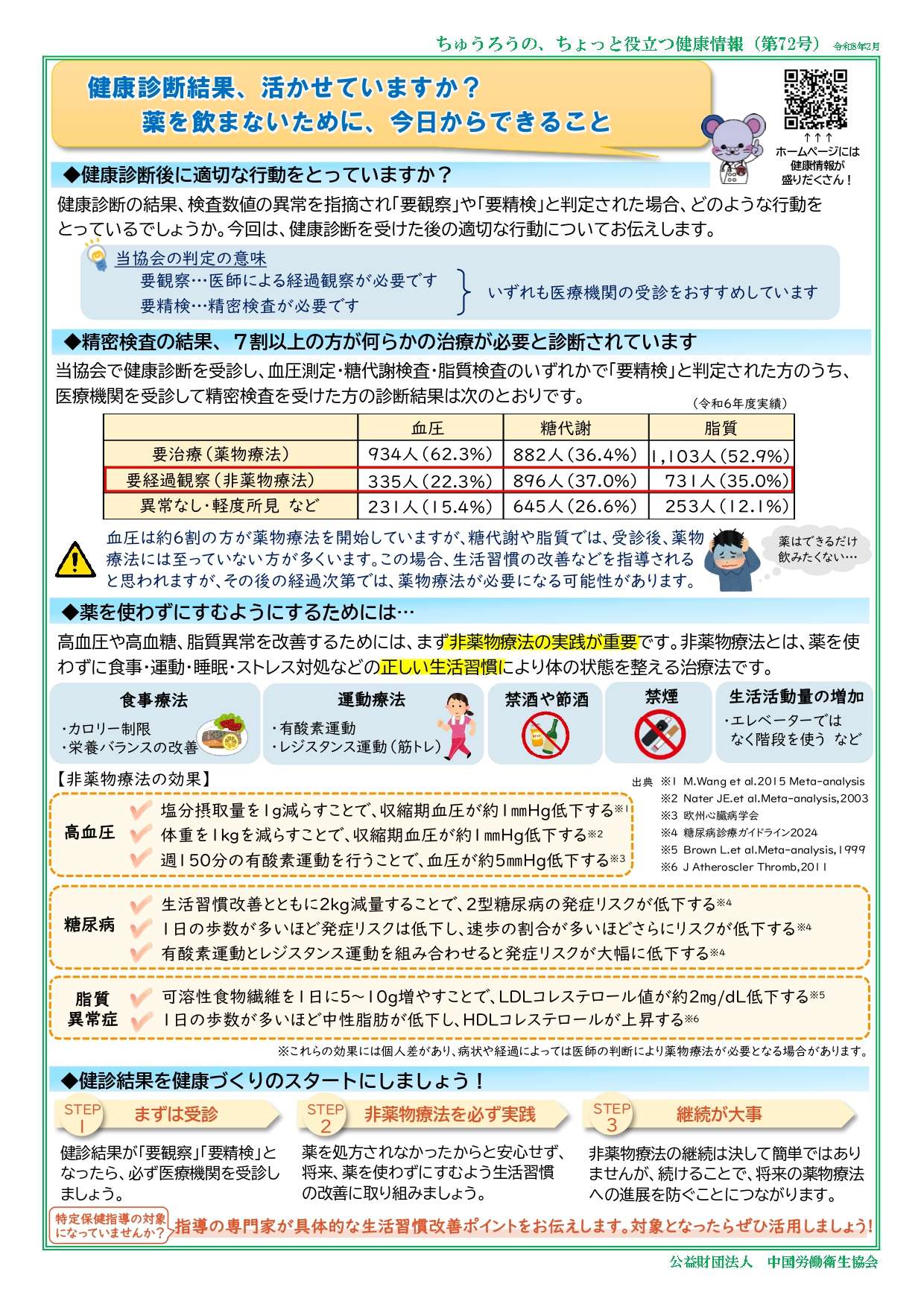 公益財団法人中国労働衛生協会が発行・掲載する文書や画像などには著作権があります。個人での閲覧や印刷などの私的利用は自由ですが、転載・引用・再配布・改変などを行う場合は、出典を明記し、内容を編集・加工した場合はその旨(改変等)を示してください。営利目的の利用はご遠慮ください。