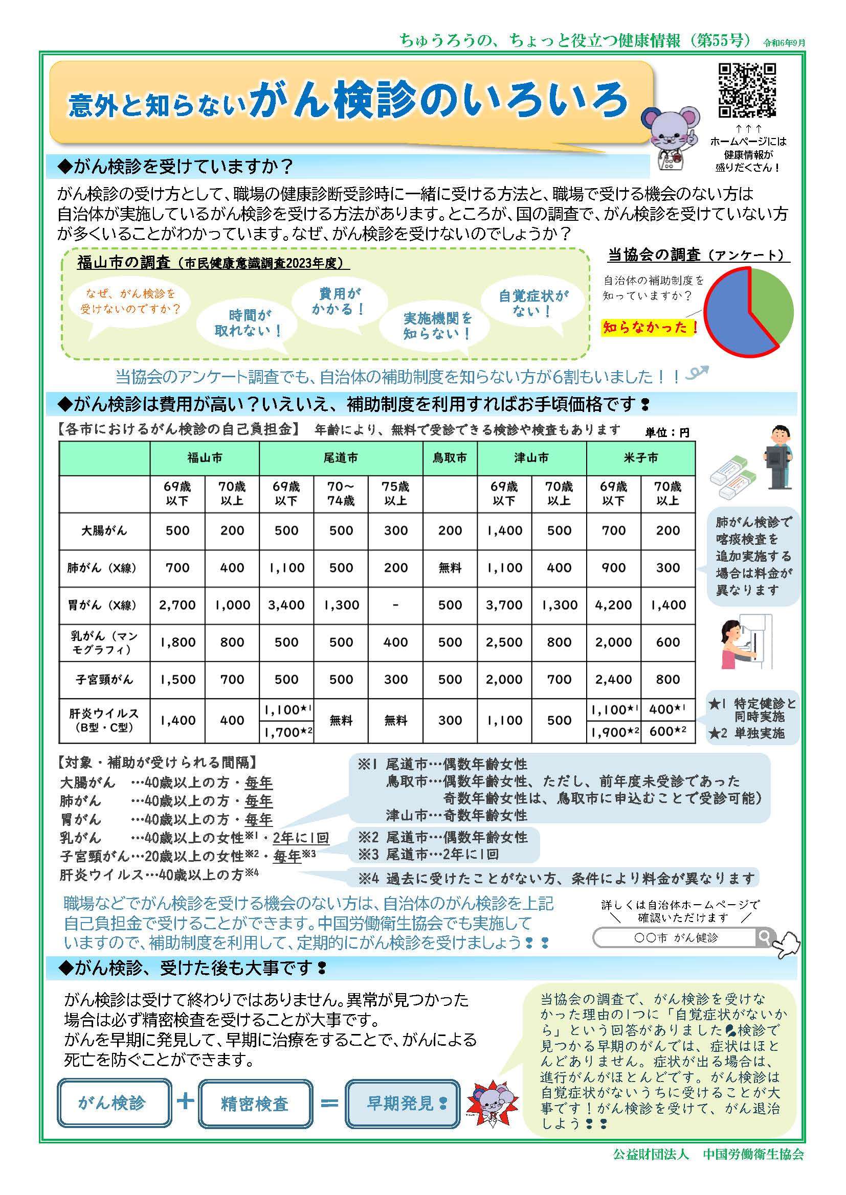 公益財団法人中国労働衛生協会が発行・掲載する文書や画像などには著作権があります。個人での閲覧や印刷などの私的利用は自由ですが、転載・引用・再配布・改変などを行う場合は、出典を明記し、内容を編集・加工した場合はその旨(改変等)を示してください。営利目的の利用はご遠慮ください。