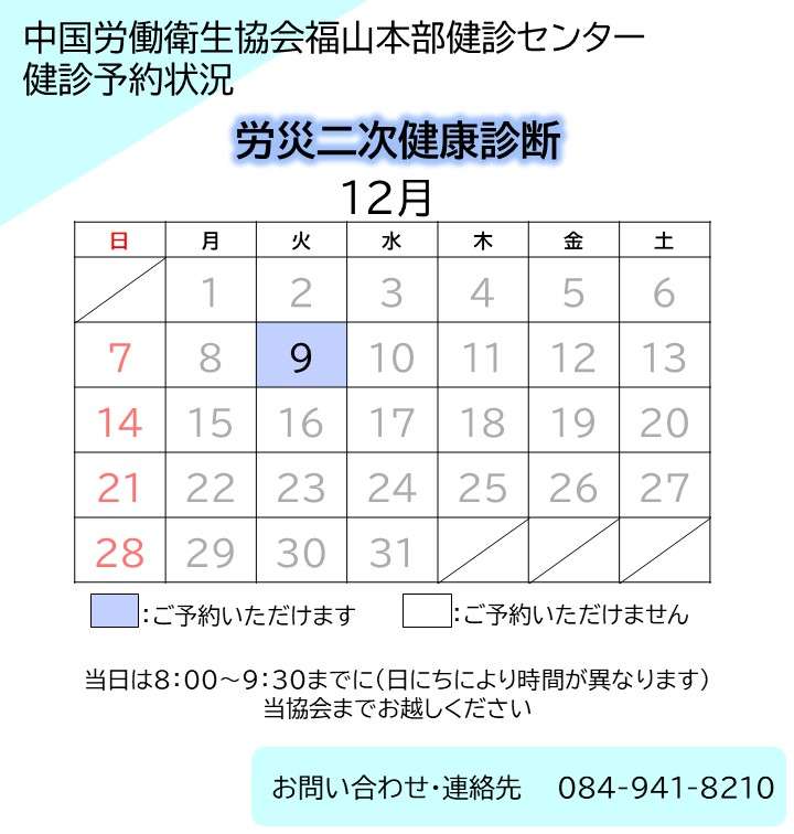 福山本部健診センター 健診予約状況(令和7年12月5日現在)