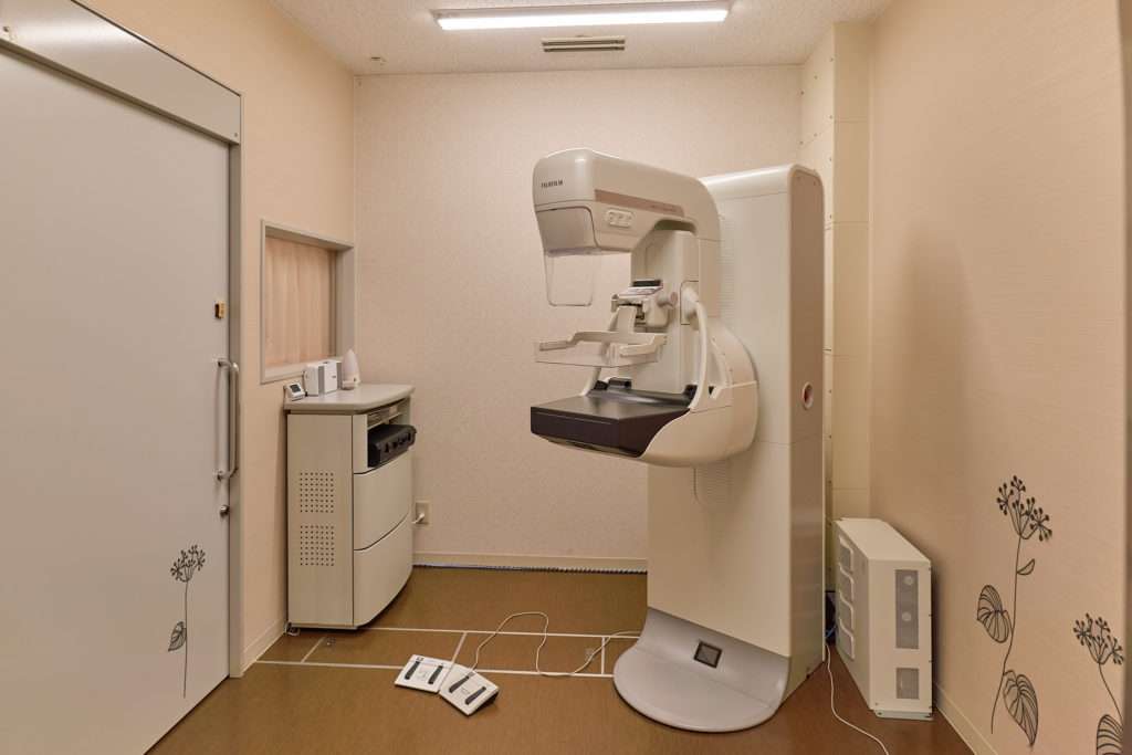 マンモグラフィは、乳房を圧迫して、乳房専用のX線装置で撮影する検査です。微細な石灰化や自分では分かりづらい小さなしこりなどを見つけることができます。乳腺は白く、脂肪は黒く写し出されます。この検査は40歳以上の方に推奨され、科学的に乳がんの死亡率を減少させることが認められています。