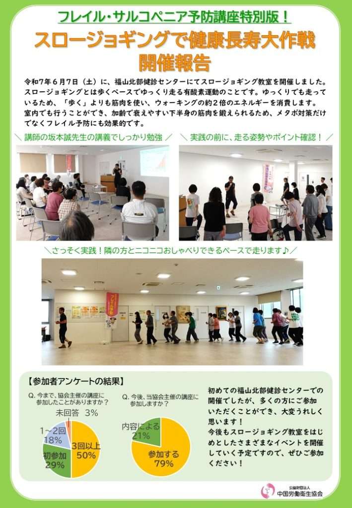 令和7年6月7日(土)に、福山本部健診センターにて、フレイル・サルコペニア予防講座特別版「スロージョギングで健康長寿大作戦」を開催しました。