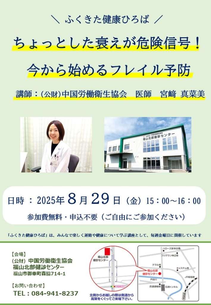 日時:8月29日(金) 15時~16時ふくきた健康ひろば 「ちょっとした衰えが危険信号!今から始めるフレイル予防」 講師:(公財)中国労働衛生協会 医師 宮崎 真菜美日時:8月29日(金) 15時~16時 -