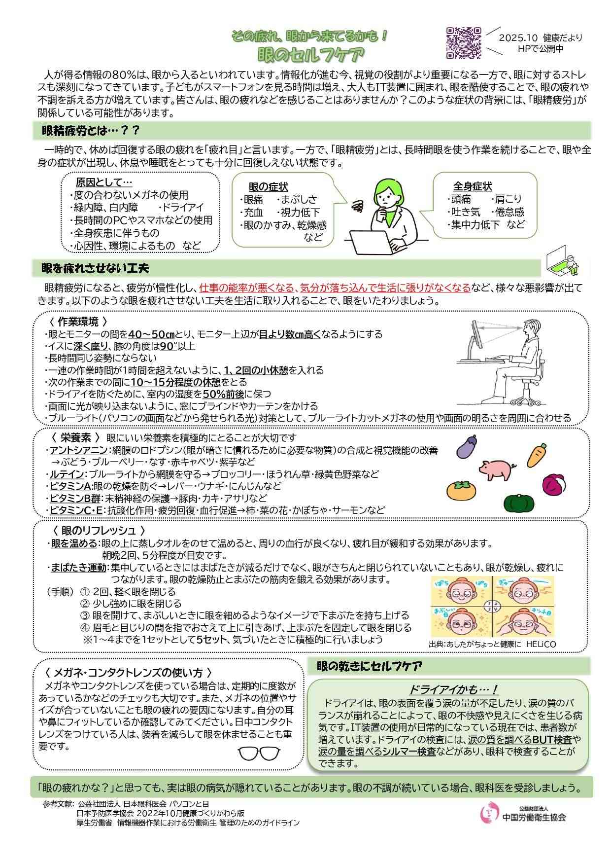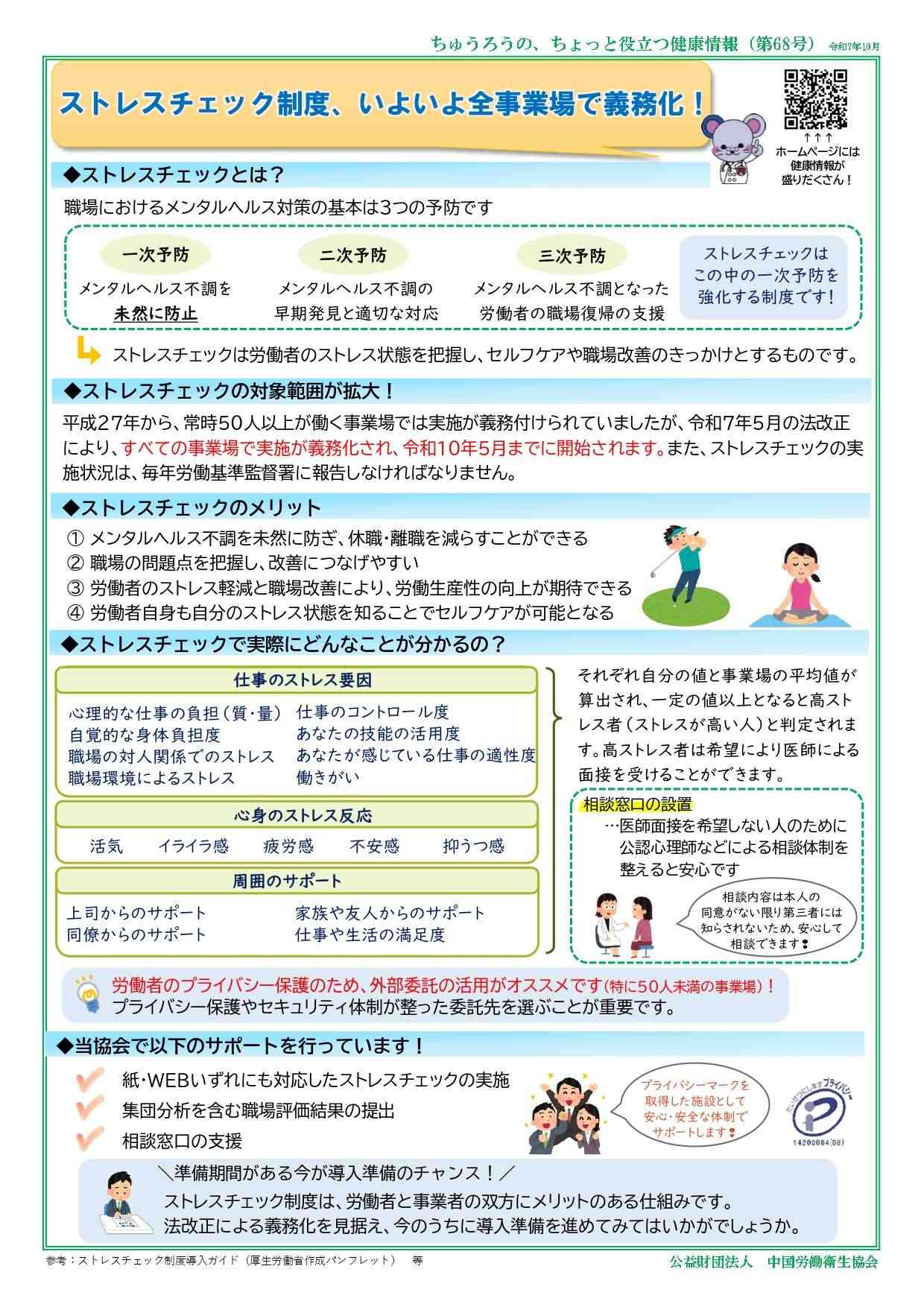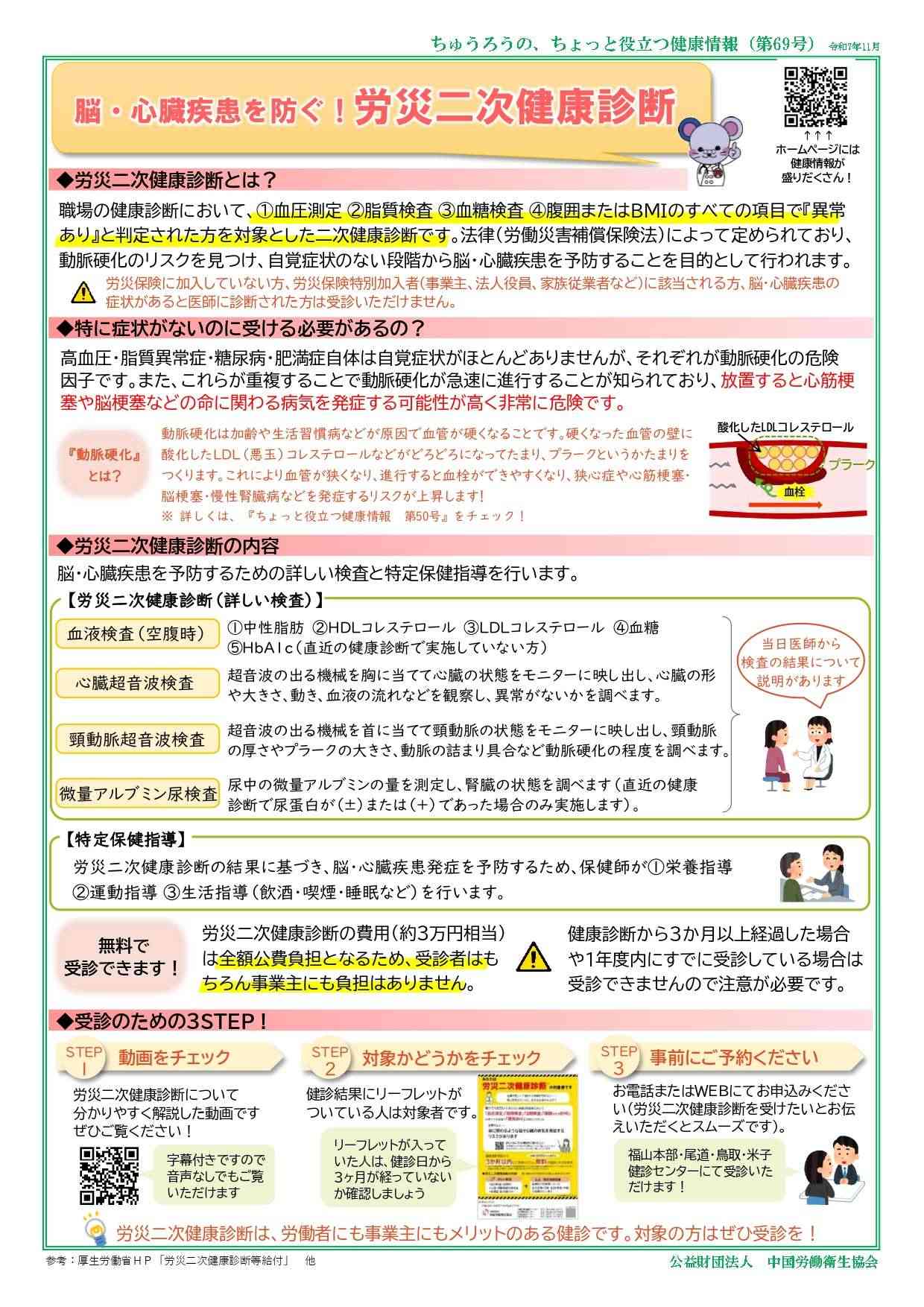 公益財団法人中国労働衛生協会が発行・掲載する文書や画像などには著作権があります。個人での閲覧や印刷などの私的利用は自由ですが、転載・引用・再配布・改変などを行う場合は、出典を明記し、内容を編集・加工した場合はその旨(改変等)を示してください。営利目的の利用はご遠慮ください。