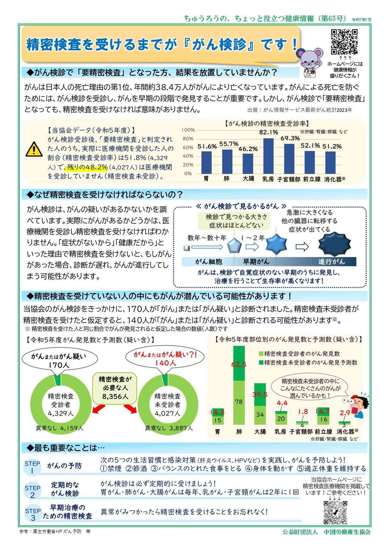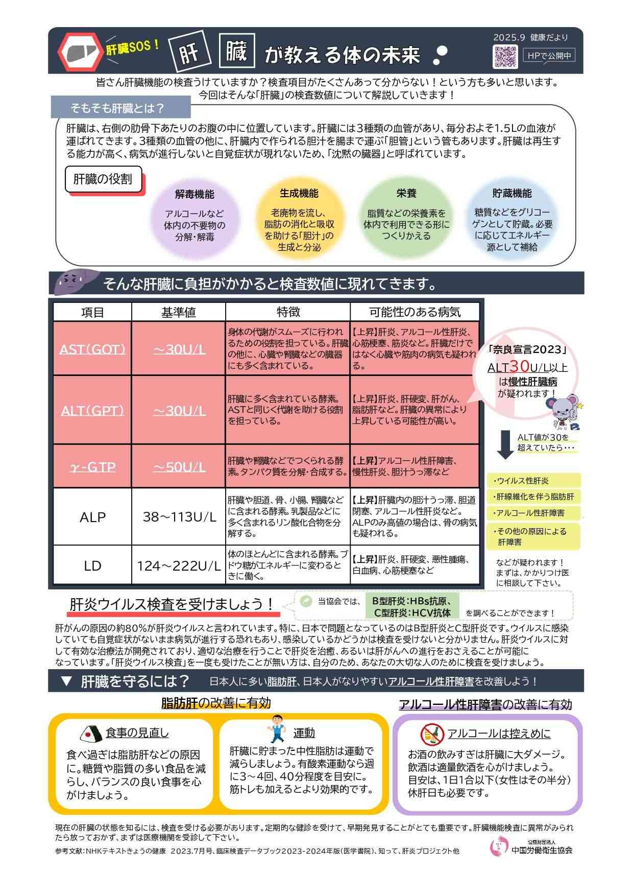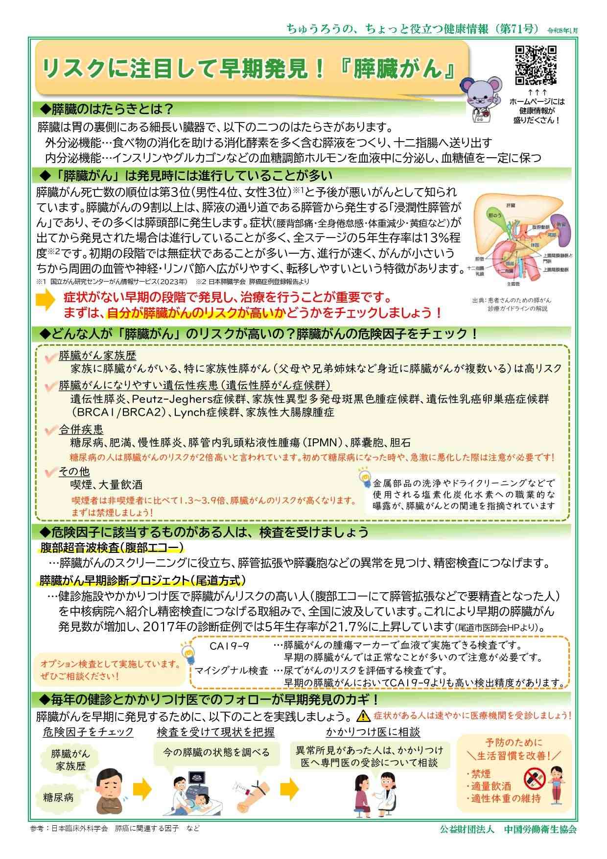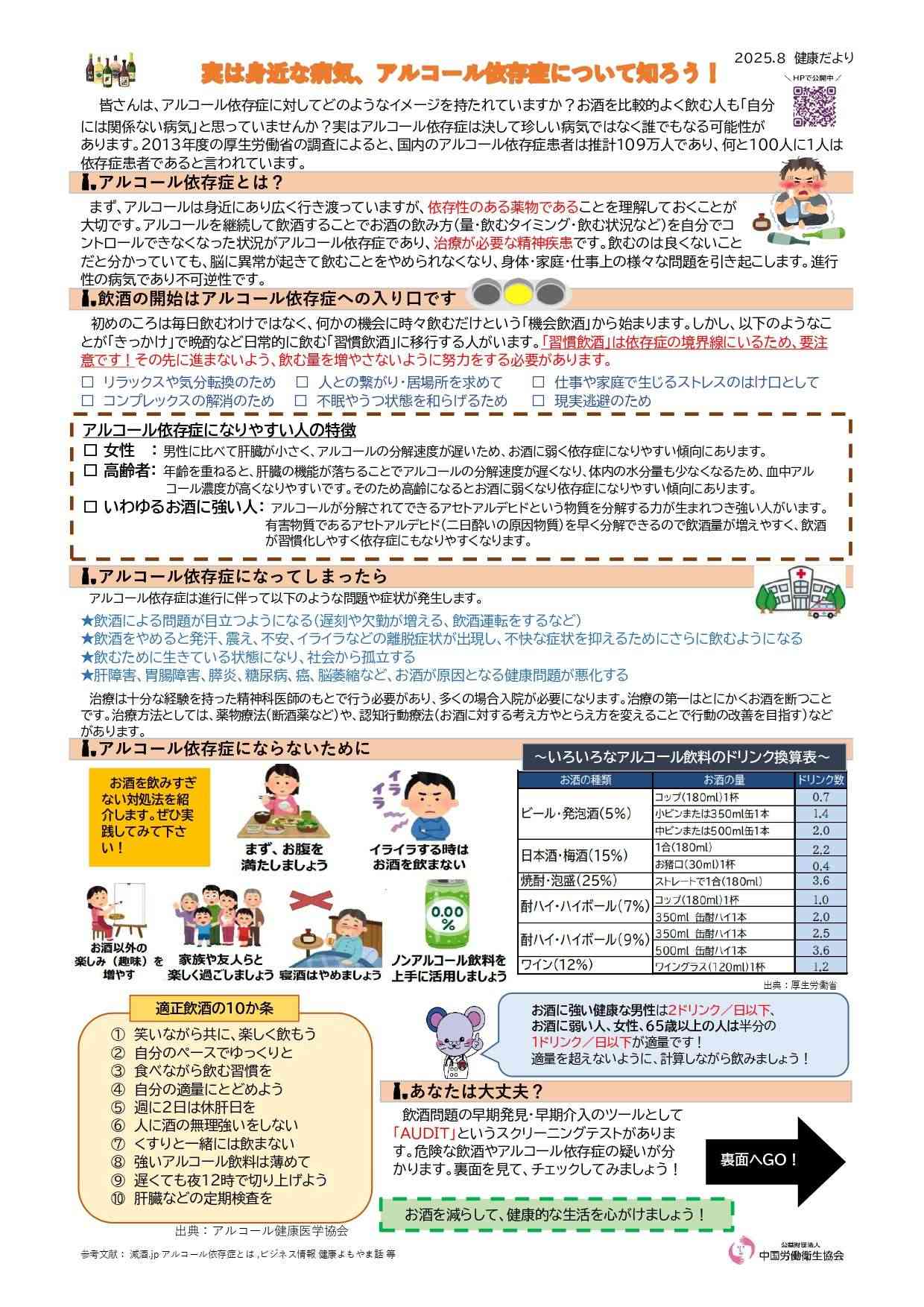 公益財団法人中国労働衛生協会が発行・掲載する文書や画像などには著作権があります。個人での閲覧や印刷などの私的利用は自由ですが、転載・引用・再配布・改変などを行う場合は、出典を明記し、内容を編集・加工した場合はその旨(改変等)を示してください。営利目的の利用はご遠慮ください。